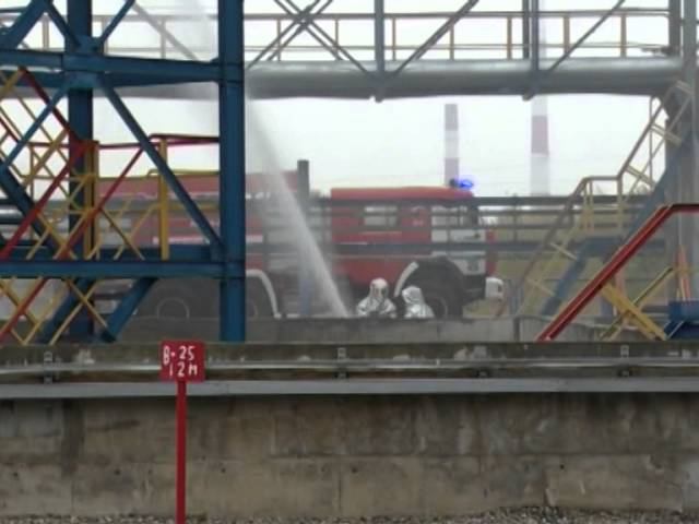 Пожарные тушат горящий газ. Учения на ОАО ""КазаньОргсинтез".