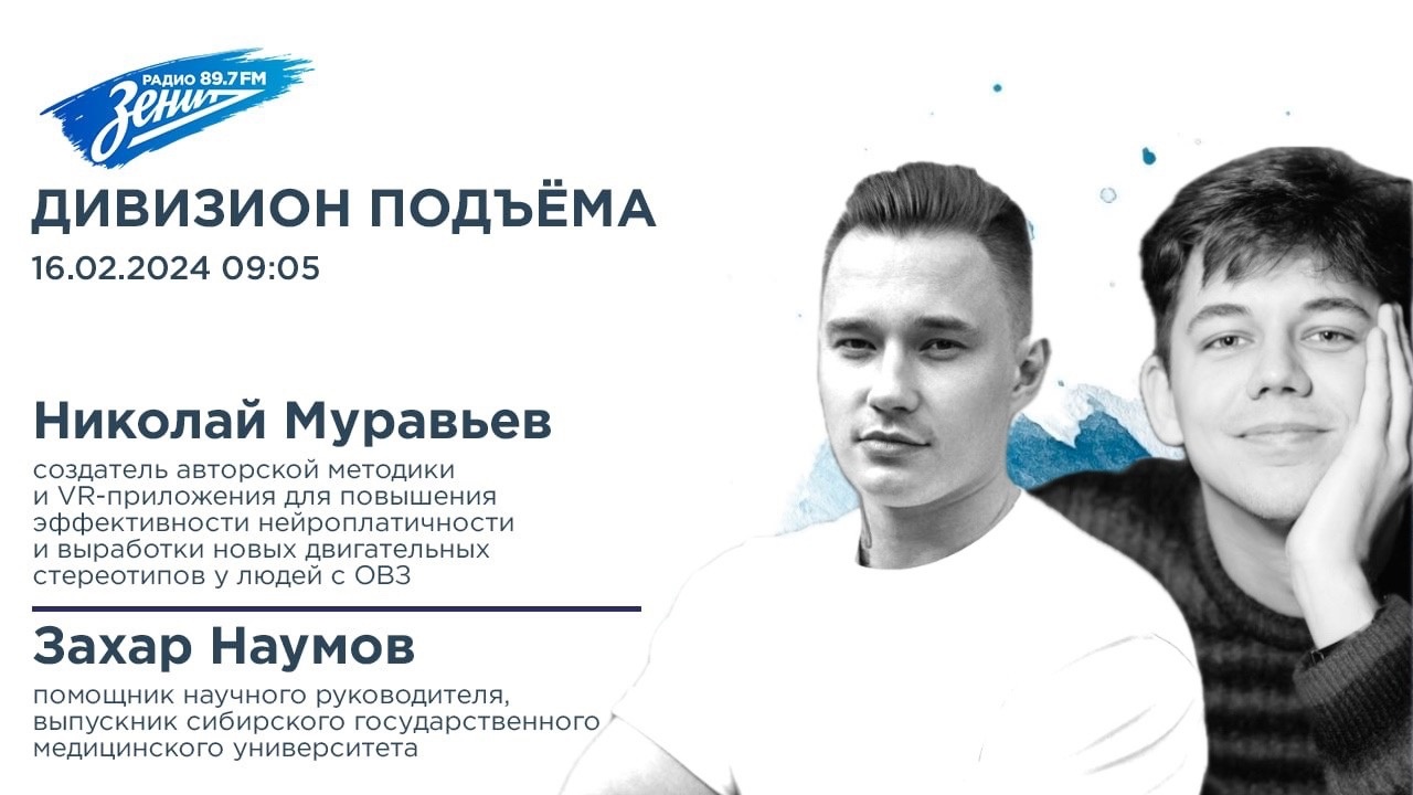 Николай Муравьев, молодой ученый, создатель авторской методики и VR-приложения для повышения нейропластичности и выработки новых двигательных стереотипов у людей с ОВЗ Захар Наумов, помощник научного руководителя, выпускник сибирского государственного медицинского университета