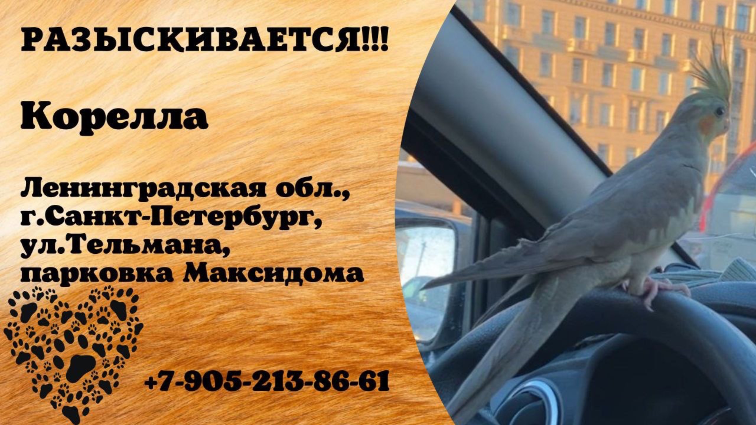 Пропал попугай! КОРЕЛЛА, Ленинградская обл., г.Санкт-Петербург.