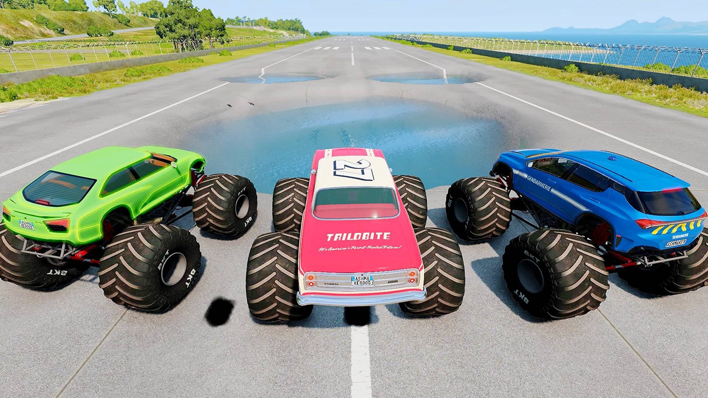 Монстр трак против гигантской ямы с водой