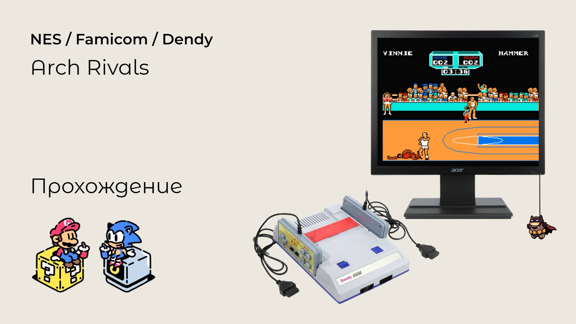 Игра Arch Rivals - A BasketBrawl! достаточно не плохой симулятор баскетбола, главной особенностью которого является возможность игры без правил. Как же иногда приятно ударить в спину противника кулаком, когда тот секундой ранее увел у вас мяч прямо из под носа! Но, будьте осторожны: противник тоже может быть очень агрессивен! Заходите на наш сайт: https://consolgame.ru #nes #retrogames #nintendo #dendy #consolgame #прохождение