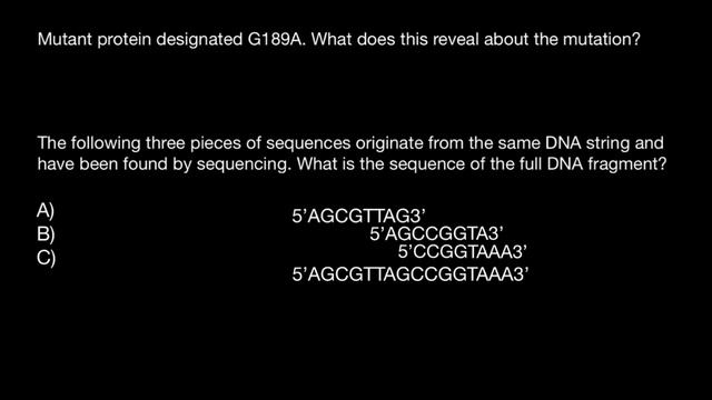 In bioinformatics, a sequence alignment is a way of arranging the sequences of DNA, RNA, or protein to identify regions of similarity that may be a consequence of functional, structural, or evolutionary relationships between the sequences. Aligned sequences of nucleotide or amino acid residues are typically represented as rows within a matrix. Gaps are inserted between the residues so that identical or similar characters are aligned in successive columns. Sequence alignments are also used for non-biological sequences, such as calculating the distance cost between strings in a natural language or in financial data. Problems: Mutant protein designated G189A. What does this reveal about the mutation? The following three pieces of sequences originate from the same DNA string and have been found by sequencing. What is the sequence of the full DNA fragment? A) 5’ AGCGTTAG 3’ B) 5’ CCGGTAAA 3’ C) 5’ AGCCGGTA 3’ https://www.youtube.com/watch?v=QElGX9LjJYE