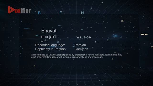 This is the Persian (Farsi) pronunciation, gender, and phonetics recording of the name Enayati (عنایتی). The same name may exist in other languages with different pronunciations. Check the meaning of name along with other possible pronunciations or similar names for free at http://www.voxifier.com. Voxifier uses the help of expert linguists to simplify pronunciations by replacing some special sounds with sounds more commonly available across all languages.
