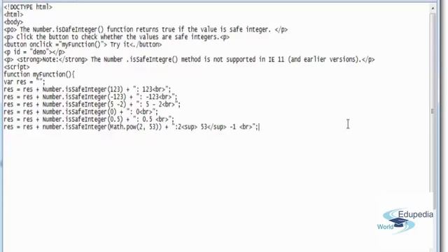 JavaScript | Number Methods 5 | Lecture 23 Course-Outline: Use Of Number . isSafeInteger() Function In Java Script Videos by Edupedia World(www.edupediaworld.com), Online Education, Click on https://www.youtube.com/playlist?list=PLJumA3phskPGIkzrJE-PaI9lYAUfhd1Tl for more Videos, All Rights Reserved.