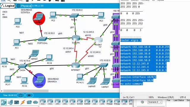 enable conf t no ip route 0.0.0.0 0.0.0.0 Serial0/0/0 no ip route 0.0.0.0 0.0.0.0 Serial0/1/0 no ip route 0.0.0.0 0.0.0.0 Serial0/0/1 -------------------eigrp 255 255 255 255- 255 255 255 0 _______________ 0 0 0 255 255 255 255 255- 255 255 255 252 _______________ 0 0 0 3 -------------- VLANS router eigrp 1 network 192.168.10.0 0.0.0.255 network 192.168.20.0 0.0.0.255 network 192.168.30.0 0.0.0.255 network 192.168.40.0 0.0.0.255 network 192.168.50.0 0.0.0.255 network 12.12.245.0 0.0.0.3 network 12.12.245.4 0.0.0.3 network 12.12.245.8 0.0.0.3 passive-interface s0/0/1 passive-interface G0/0 no auto-summary -------------------eigrp 255 255 255 255- 255 255 252 0 _______________ 0 0 3 255 -------------- PORTUGAL Y RUSIA router eigrp 1 network 172.16.50.0 0.0.3.255 network 172.16.60.0 0.0.3.255 network 12.12.245.0 0.0.0.3 network 12.12.245.4 0.0.0.3 network 12.12.245.8 0.0.0.3 passive-interface s0/0/0 passive-interface G0/0 passive-interface G0/1 no auto-summary -------------------eigrp 255 255 255 255- 255 255 252 0 _______________ 0 0 3 255 -------------- CASA Y VECINO router eigrp 1 network 172.16.70.0 0.0.3.255 network 172.16.82.0 0.0.3.255 network 12.12.245.0 0.0.0.3 network 12.12.245.4 0.0.0.3 network 12.12.245.8 0.0.0.3 passive-interface s0/1/0 passive-interface G0/0 passive-interface G0/1 no auto-summary