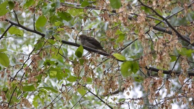 Воробей ест семена вяза, наблюдение птиц в Великом Новгороде 03.06.2023