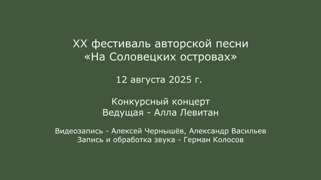 XX фестиваль авторской песни «На Соловецких островах». 12 августа 2025 г. Конкурсный концерт. Ведущая - Алла Левитан. Видеозапись - Алексей Чернышёв, Александр Васильев. Запись и обработка звука - Герман Колосов.