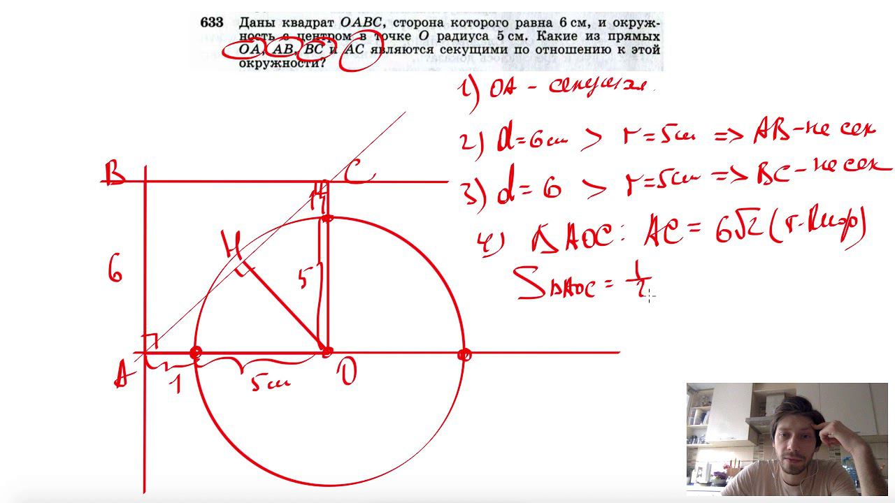 №633. Даны квадрат ОАВС, сторона которого равна 6 см, и окружность с центром в точке О радиуса 5 см. Какие из прямых ОА, АВ, ВС и АС являются секущими по отношению к этой окружности? Поддержать канал рублём - 5469400944002125 (Сбербанк) Мой второй канал для подготовки к ЕГЭ и ОГЭ - https://www.youtube.com/ЕвгенийСумин Инстаграм - https://www.instagram.com/EGE_OGE.math Личный инстаграм - https://www.instagram.com/ee_sumin VK - https://vk.com/evgeniysumin FB - https://www.facebook.com/EvgeniySumin