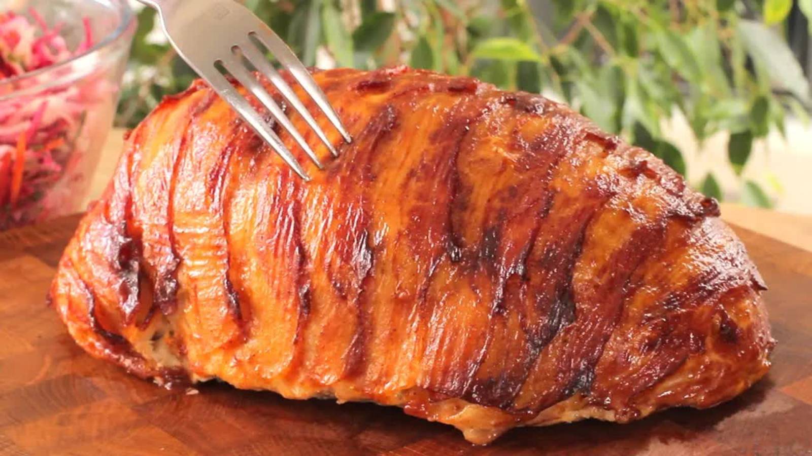 Скоро зима, а значит не за горами Новый год и Рождество! Некоторые из вас уже сейчас думают, что бы такого необычного приготовить на Новый год и просят меня поделиться своими рецептами - сегодня один из них. Будем готовить шикарный мясной рулет из фарша. Это блюдо можно подать в виде основного горячего, а также в качестве холодной закуски. Красивый, эффектный и несомненно праздничный! Такой шикарный рулет получается вкусный, плотный, хорошо нарезается, а за счет начинки сочный и очень аппетитный! Этому ароматному мясному блюду будут рады все - и ваши гости, и члены семьи! Преимущество этого рецепта в том, что рулет можно подготовить накануне, обернуть его пленкой или сразу завернуть в фольгу и хранить в холодильнике, а за пару часов до подачи на стол, достать, чтобы он слегка согрелся и отправить в духовку. Кроме того, если запеченный рулет остался, уберите его в пакет и отправьте в холодильник, а на утро у вас будет готова отличная мясная нарезка. В холодном виде этот рулет можно нарезать довольно тонкими ломтиками и подать вместо колбасы для утренних бутербродов. Очень надеюсь, что вам понравился такой вариант приготовления и подачи мясного блюда на праздничный стол и если это так, не забудьте поставить лайк! Готовьте с удовольствием! Приятного всем аппетита! Ингредиенты: 1кг фарша 2 яйца 1/3 стакана молока 1 стакан панировочных сухарей Панко 1 белая луковица 1 перец халапеньо 3-4 зубчика чеснока соль, черный перец 1 ч. л. копченой паприки 1 ч. л. сушеного чеснока 1 ч. л. кориандра 1/4 ч. л. острого перца чили 1/2 ч. л. розмарина 1/2 ч. л. тимьяна 1/2 фунта сыра чеддер (около 220 г) 12-15 ломтиков бекона Глазурь: 1/2 стакана кетчупа 1 ст. л. тростникового сахара 1 ст. л. вустерширского соуса 1 ч. л. острого соуса чили 1 ч. л. копченой паприки щепотка черного перца 1 ст. л. яблочного уксуса 1/2 ч. л. соли Овощной салат: 1 кочан капусты 1 морковь 1 свекла 1 яблоко Свежая петрушка 1 ст. л. лимонного сока 3 ст. л. оливкового масла 1 лимон. как приготовить мясной рулет из фарша, мясной рулет из фарша, мясной рулет из фарша в беконе, мясной рулет из фарша в духовке, мясной рулет из фарша в фольге, мясной рулет из фарша пошагово, мясной рулет из фарша пошаговый, мясной рулет из фарша с грибами, мясной рулет из фарша с начинкой, мясной рулет из фарша с сыром, мясной рулет из фарша с яйцом, мясной рулет рецепт в духовке из фарша, рецепт мясного рулета из фарша, рецепт мясного рулета из фарша с яйцом, рецепты мясного рулета из фарша фото, рулет из лаваша с мясным фаршем, рулет из мясного фарша запеченный, рулет из мясного фарша запеченный в духовке, рулет мясной из фарша с начинкой запеченный, фото мясного рулета из фарша,