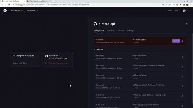 E Store Api This is a tutorial project for building an e-commerce RESTful API from scratch by following code comments via GitHub. Comment No. 6: Railway cloud. Environment Variables. GitHub: ? E Store Api : https://github.com/dr-montasir/e-store-api ? All commits : https://github.com/dr-montasir/e-store-api/commits/main/ ? Commit No.6 : https://github.com/dr-montasir/e-store-api/commit/6fac83478029737be8f3269a15f7864ca1af19eb