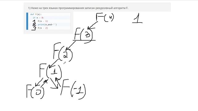 http://egoroffartem.pythonanywhere.com/ege/task/11 На сайте размещены другие задания по этой теме http://egoroffartem.pythonanywhere.com/ege/videotask/11 Список всех разборов 11 задания из ЕГЭ по информатике: https://www.egoroffartem.ru/ege/videotask/ Видео решения задач по ЕГЭ информатике https://vk.com/egoroff_channel В данном группе можете найти информацию о новых видео и задать вопросы по ЕГЭ Информатике ЕГЭ Информатика Демоверсия 2019 Ниже на пяти языках программирования записан рекурсивный алгоритм F. def F(n): if n less 0: F(n - 1) print(n) F(n - 2) Запишите подряд без пробелов и разделителей все числа, которые будут напечатаны на экране при выполнении вызова F(4). Числа должны быть записаны в том же порядке, в котором они выводятся на экран.