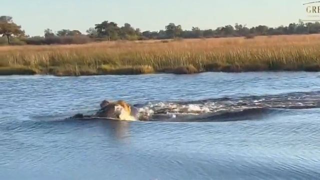 Бегемот нападает на 3 львов, переходящих реку