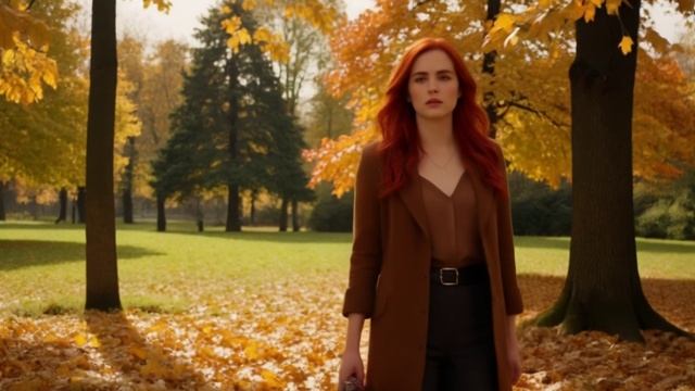 Футаж Девушка с рыжими волосами в осеннему лесу.mp4