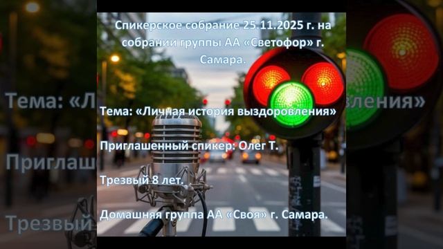 Спикерское собрание 25.11.2025 г. на собрании группы АА "Светофор" на тему "Личная история выздоровления". Спикер: Олег Т. Трезвый 8 лет Домашняя группа АА "Своя" г. Самара