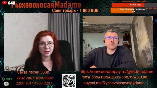 Стримы проводим на новом канале по ссылке https://www.youtube.com/channel/UCpd7cP8a8TbXkhRfZB9-V1g также стримы можно смотреть на следующих платформах https://vkplay.live/rmadame https://vk.com/video/ @RMadame https://boosty.to/ryzhevolosaya-madame Пообщаться в голосовом чате, обсудить новости и узнать первым о предстоящем стриме можно подписавшись на телеграмм канал https://t.me/redheadMadamchat Все беседы ведутся с развлекательной целью и не направлены на разжигание какой либо вражды. Поддержать меня карта Сбер 2202 2067 3874 8602, Тинькофф 2200 7009 0724 4924 или голосовым донатом по ссылке https://www.donationalerts.com/r/alladm