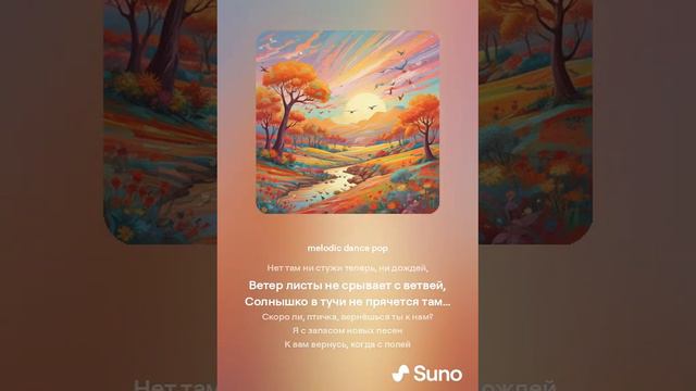 00:00 свейв 03:10 европоп 80 06:14 поп дэнс 09:54 поп дэнс 2 12:54 поп 16:12 мелодик поп 19:48 европоп 80 2 «Птичка! Нам жаль твоих песенок звонких! Не улетай от нас прочь… Подожди!»— «Милые крошки! Из вашей сторонки Гонят меня холода и дожди. Вон на деревьях, на крыше беседки Сколько меня поджидает подруг! Завтра вы спать ещё будете, детки, А уж мы все понесёмся на юг. Нет там ни стужи теперь, ни дождей, Ветер листы не срывает с ветвей, Солнышко в тучи не прячется там…»— «Скоро ли, птичка, вернёшься ты к нам?» «Я с запасом новых песен К вам вернусь, когда с полей Снег сойдёт, когда в овраге Зажурчит, блестя, ручей— И начнёт под вешним’ солнцем Вся природа оживать… Я вернусь, когда, малютки, Вы уж будете читать!» сгенерировано нейросетями SUNO, UDIO