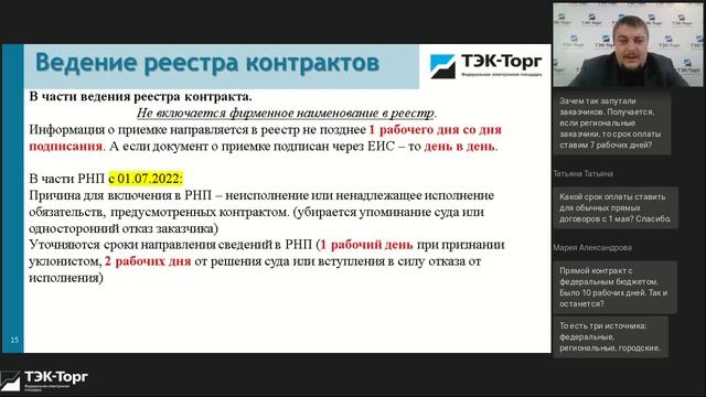 На консультации обсудили: - новые сроки оплаты по контракту - изменения в законодательстве о контрактной системе вносимые Федеральным законом №104-ФЗ от 16.04.2022 - возможность осуществления закупки на проектирование и ремонт объекта культурного наследия - проблемы нормирования закупок при росте цен График предстоящих обучающих мероприятий: https://www.tektorg.ru/education Закажите индивидуальное обучение: edu@tektorg.ru Наш Vk: https://vk.com/etptektorg Наш ТГ: https://t.me/etp_tektorg