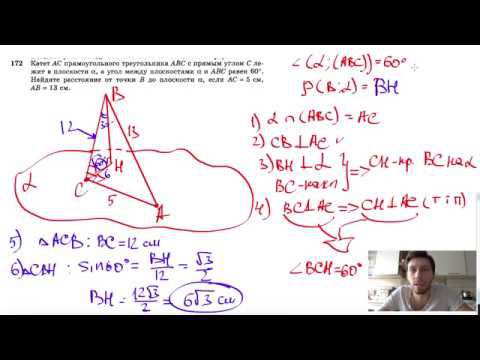 №172. Катет АС прямоугольного треугольника ABC с прямым углом С лежит в плоскости α, а угол между плоскостями α и ABC равен 60°. Найдите расстояние от точки В до плоскости α, если АС = 5 см, АВ = 13 см. Поддержать канал рублём - 5469400944002125 (Сбербанк) Мой второй канал для подготовки к ЕГЭ и ОГЭ - https://www.youtube.com/ЕвгенийСумин Инстаграм - https://www.instagram.com/EGE_OGE.math Личный инстаграм - https://www.instagram.com/ee_sumin VK - https://vk.com/evgeniysumin FB - https://www.facebook.com/EvgeniySumin