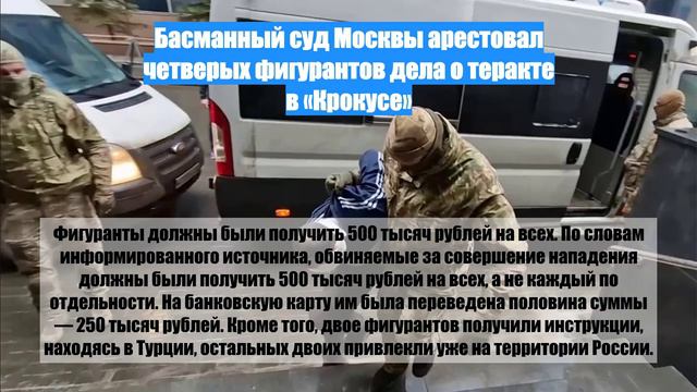 Басманный суд Москвы арестовал четверых обвиняемых в деле о теракте в "Крокус Сити Холле". Обвиняемым грозит наказание до пожизненного лишения свободы. Фигуранты должны были получить 500 тысяч рублей на всех, а не каждый по отдельности. В результате нападения на "Крокус Сити Холл" пострадали 182 человека, 68 человек не выжили. Спасатели МЧС России разобрали больше 400 кубометров обрушившихся конструкций в здании "Крокус Сити Холла". Нападение произошло в пятницу, 22 марта, перед выступлением группы "Пикник". Несколько человек вошли в помещение и открыли огонь по охране и посетителям, после чего начали поджигать помещение.
