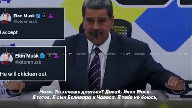 Битва года: Илон Маск согласился на бой с президентом Венесуэлы Николасом Мадуро «Если он [Мадуро] победит, я подарю ему бесплатную поездку на Марс», — добавил владелец Tesla и SpaceX. Ранее Илон Маск назвал Мадуро «диктатором Венесуэлы» и несколько раз заявлял о фальсификации выборов. Видео и фото: соцсети #США #Венесуэла