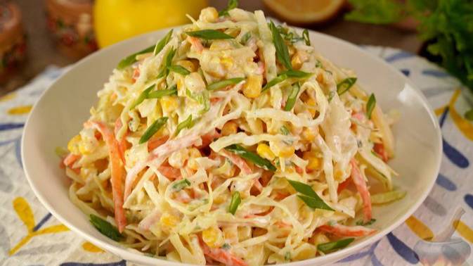 Капустный салат со свежей морковью, яблоком, консервированной кукурузой и зелёным луком. Кислинку салату придаёт яблоко и сок лимона, а лёгкую сладость добавляет кукуруза. Заправляется овощной салат сметаной. #Салаты #ОвощнойСалат #КапустныйСалат