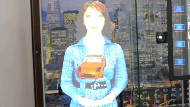 Virtual holographic assistant is a 3D model of a human being, e.g. a girl or a business woman. Demonstration at MAC-2012, Russia. Виртуальная модель человека, может использоваться в качестве виртуального промоутера. Используется технология сверхтонких световых панелей. Демонстрация на выставке MAC-2012.