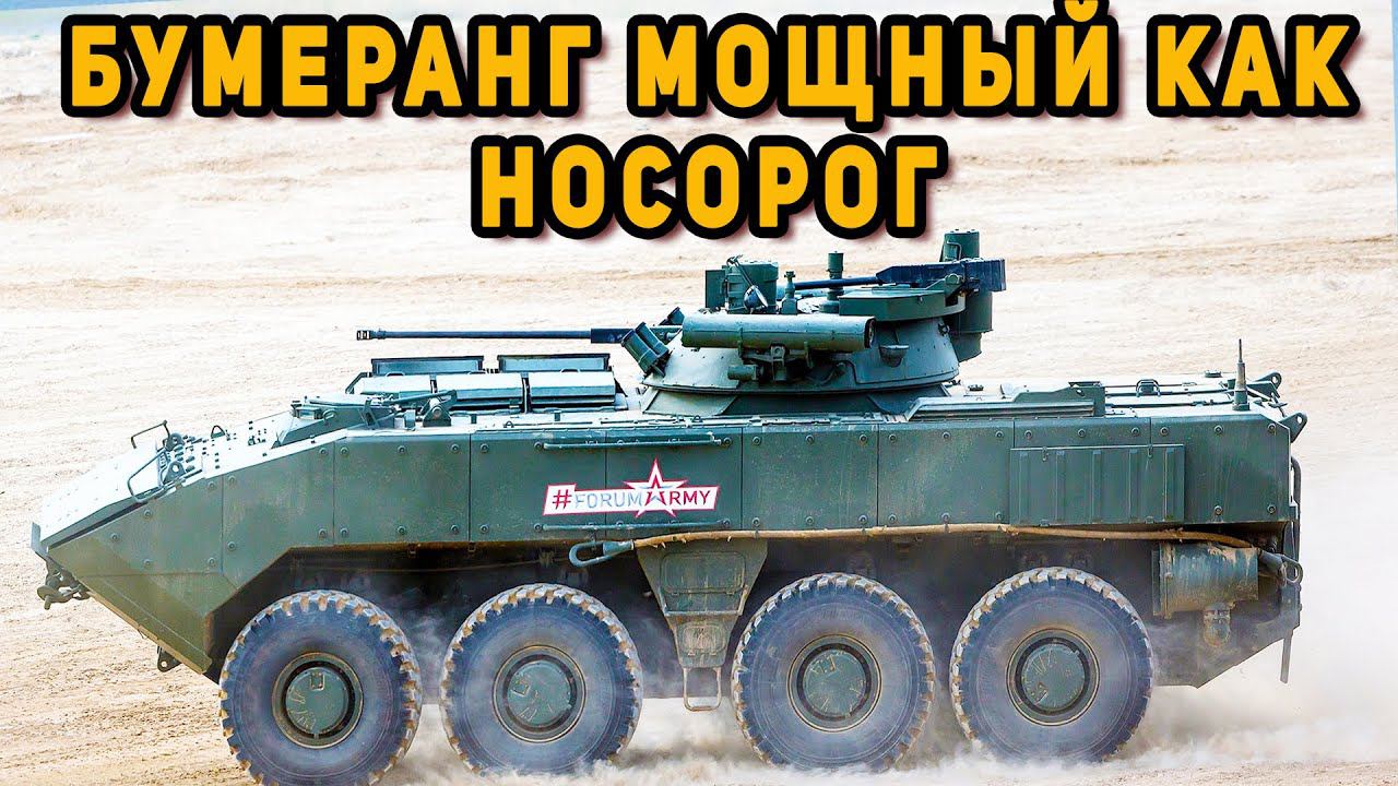 Рособоронэкспорт заявил, что начинает работы по выводу на мировой рынок боевой платформы "Бумеранг", это будет делаться более активно и вполне официально. БМП "Бумеранг - одна из самых интересных в своем классе. Никогда прежде у нас не создавались колесные бронеавтомобили, имеющие массу и защиту, сравнимую с танком. Масса "Бумеранга" 34 тонны, для сравнения, масса Т-34 была около 30 тонн. "Бумеранг" представлен в виде хорошо защищенной и вооруженной боевой машины пехоты, к тому же она - плавающая. . В качестве защиты использовано многослойное бронирование с содержанием керамики. Управление находится в передней части машины, боевое отделение в середине, а отделение десанта в кормовой части. В БМП может размещаться до 11 человек. Бумеранг" оснащен независимой подвеской, дизельным двигателем мощностью 750 л.с., способен преодолевать различные препятствия и развивать на асфальте скорость свыше 100 км/ч. Запас хода составляет не менее 800 км.