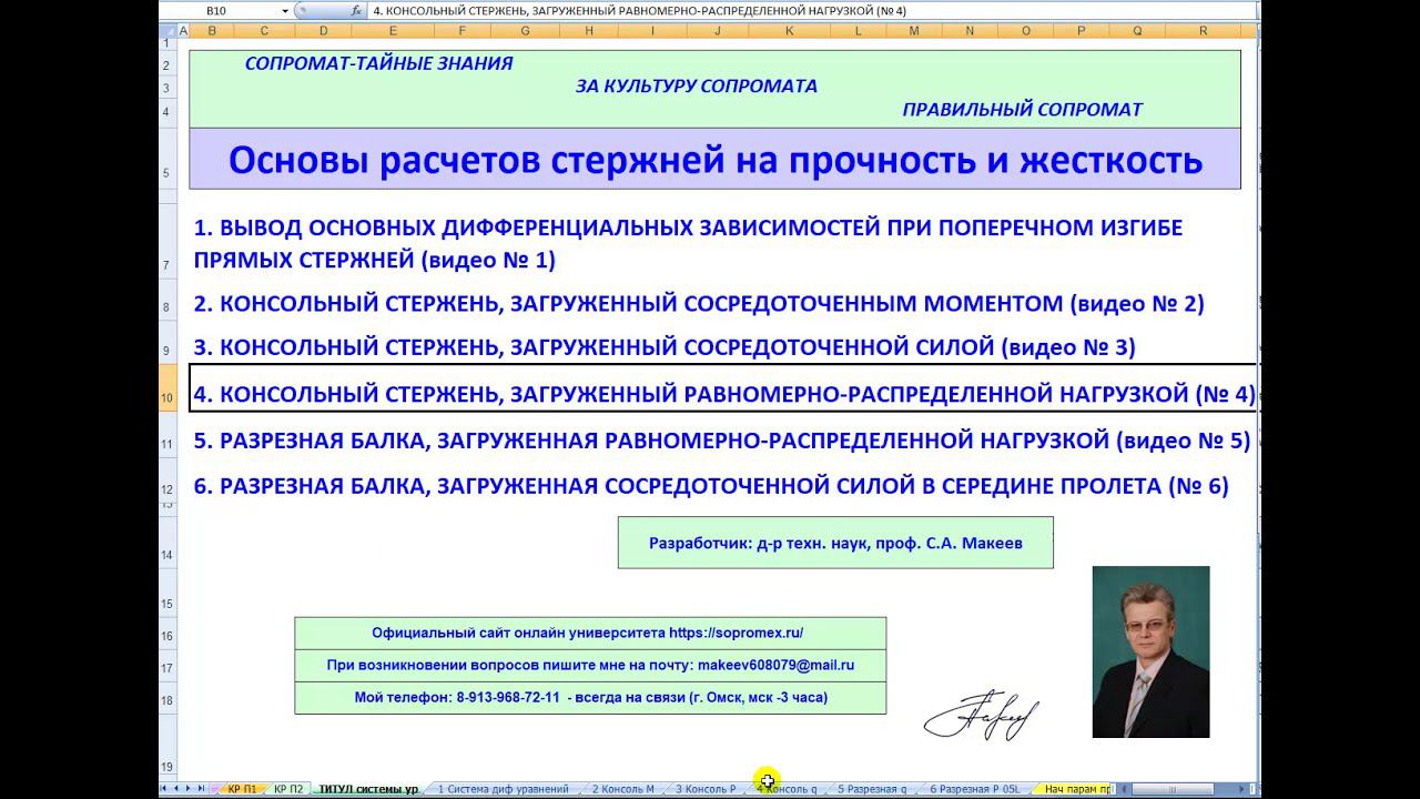 Сайт онлайн университета https://sopromex.ru/ Подписка на все мои бесплатные материалы https://makeev.justclick.ru/podpiska_2020 Начинаем публикацию цикла бесплатных видео материалов проф. Макеева С.А. "Правильный сопромат" - сегодня публикуем "Введение". Далее будет 6 последовательных видео. На ЮТ канале видео будут собраны в плейлист "ПРАВИЛЬНЫЙ СОПРОМАТ" https://www.youtube.com/playlist?list=PLRg82kZ234fIBkjPXeAT2GhQkDlB0pdc3 1. ВЫВОД ОСНОВНЫХ ДИФФЕРЕНЦИАЛЬНЫХ ЗАВИСИМОСТЕЙ ПРИ ПОПЕРЕЧНОМ ИЗГИБЕ ПРЯМЫХ СТЕРЖНЕЙ (видео № 1 в трех частях: Часть 1, Часть 2, Часть 3); 2. КОНСОЛЬНЫЙ СТЕРЖЕНЬ, ЗАГРУЖЕННЫЙ СОСРЕДОТОЧЕННЫМ МОМЕНТОМ (видео № 2); 3. КОНСОЛЬНЫЙ СТЕРЖЕНЬ, ЗАГРУЖЕННЫЙ СОСРЕДОТОЧЕННОЙ СИЛОЙ (видео № 3); 4. КОНСОЛЬНЫЙ СТЕРЖЕНЬ, ЗАГРУЖЕННЫЙ РАВНОМЕРНО-РАСПРЕДЕЛЕННОЙ НАГРУЗКОЙ (№ 4); 5. РАЗРЕЗНАЯ БАЛКА, ЗАГРУЖЕННАЯ РАВНОМЕРНО-РАСПРЕДЕЛЕННОЙ НАГРУЗКОЙ (видео № 5); 6. РАЗРЕЗНАЯ БАЛКА, ЗАГРУЖЕННАЯ СОСРЕДОТОЧЕННОЙ СИЛОЙ В СЕРЕДИНЕ ПРОЛЕТА (№ 6). При расчете стержней мы применяем правую систему координат с началом на левом конце стержня, при этом размещаем оси ху в сечении с ориентацией оси у вверх, как и учили нас в школе, оставшуюся ось z направляем вдоль стержня слева направо. При таком подходе не нужны ПРАВИЛА знаков внутренних сил, и правила знаков построения эпюр (часовая стрелка, правило "зонтика", правило "акробата", часовая стрелка…). Правильные эпюры строятся автоматически сами собой, исходя из принципа правой системы координат, нет никакой путаницы, при этом эпюра изгибающих моментов строится на растянутом волокне, как и положено у строителей...
