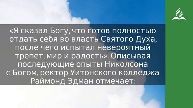 Ибо Я изолью воды на жаждущее и потоки на иссохшее; излию дух Мой на племя твое и благословение Мое на потомков твоих (Ис. 44:3). Уильям Николсон жаждал проявления победоносной силы Святого Духа в своей жизни. Спустя семь месяцев после обращения у него возникло сильное желание получить еще больше даров Святого Духа, которые сделают его настоящим слугой Господа. В городе Бангоре в Северной Ирландии местный бизнесмен организовал христианский съезд, посвященный духовному росту. Святой Дух направлял Уильяма, и в один из дней съезда он почувствовал духовный голод как никогда. «Я сказал Богу, что готов полностью отдать себя во власть Святого Духа, после чего испытал невероятный трепет, мир и радость». Описывая последующие опыты Николсона с Богом, ректор Уитонского колледжа Раймонд Эдман отмечает: «На углах улиц и в сельских хижинах, в городах и деревнях, в церквах и на железной дороге, где работал, Николсон бесстрашно и пламенно завоевывал души для Христа» (They Found The Secret, p. 103). До начала всемирного евангельского служения доктора Вилбера Чапмана и Чарльза Александра Дух Святой могущественным образом использовал Уильяма Николсона в разных частях Британии, особенно в деревнях шахтеров. Эдман рассказывает о прекрасных плодах, выросших благодаря этим потокам воды на сухой земле: «Благодаря служению Уильяма в силе Святого Духа многие пришли к спасительному знанию о Господе Иисусе, посвятили свою жизнь Спасителю и стали исполненными Духом христианами, спасающими других от греха» (там же, с. 104). МОЛИТВА Отец Небесный, ныне настало для меня время испить от потока Твоих вод. Я жажду и славлю Тебя за благословения Твоего Духа. https://esd.adventist.org/library/periodicals/ezhednevnyie-chteniya/ #адвентисты #АдвентистыСедьмогоДня #Церковь #ЦерковьАдвентистовСедьмогоДня #ЦерковьХристианАдвентистовСедьмогоДня