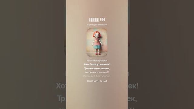 Стихи: Роман Сергеевич Музыка и вокал: Suno AI [intro] [verse 1] Пара пуговиц чёрных Вместо глаз! (вместо глаз!) ИгОлка и нитка... Прямо здесь и сейчас В них поЯвится жизнь, В этих маленьких глазках, Такое бывает Только лишь в сказках! [bridge] [pre-chorus] Кукольный мастер! (кукольный мастер!) Всё в твоей власти! (всё в твоей власти!) [bridge] [chorus] Тряпичный человечек, Тряпичный человечек! Ну скажи, ну скажи Хотя бы пару словечек! Тряпичный человечек, Человечек тряпичный! Скажи: всё будет хорошо, Всё будет отлично! [bridge] [verse 2] Вот здесь будет рОтик, А вот здесь будут ушки... Ты будешь спать рядом Со мной на подушке, Ты оживешь через миг, (ты оживешь через миг) Такое бывает На страницах лишь книг! [bridge] [pre-chorus] Кукольный мастер! (кукольный мастер!) Всё в твоей власти! (всё в твоей власти!) [bridge] [chorus] Тряпичный человечек, Тряпичный человечек! Ну скажи, ну скажи Хотя бы пару словечек! Тряпичный человечек, Человечек тряпичный! Скажи: всё будет хорошо, Всё будет отлично! [bridge] [solo] [verse 3] Красным вышито сердце У него на грудИ, Волшебная жизнь Впереди! (впереди!) Он все слышит, всё видит, Он всё понимает! Такое бывает! Такое бывает! [bridge] [pre-chorus] Кукольный мастер! (кукольный мастер!) Всё в твоей власти! (всё в твоей власти!) [bridge] [chorus] Тряпичный человечек, Тряпичный человечек! Ну скажи, ну скажи Хотя бы пару словечек! Тряпичный человечек, Человечек тряпичный! Скажи: всё будет хорошо, Всё будет отлично! [chorus] Тряпичный человечек, Тряпичный человечек! Ну скажи, ну скажи Хотя бы пару словечек! Тряпичный человечек, Человечек тряпичный! Скажи: всё будет хорошо, Всё будет отлично! [outro] [end] 30.10,2024