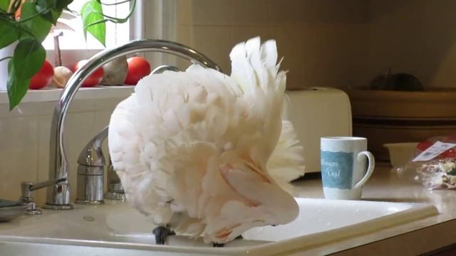 Какаду по кличке Лол любит принимать душ в кухонной раковине.