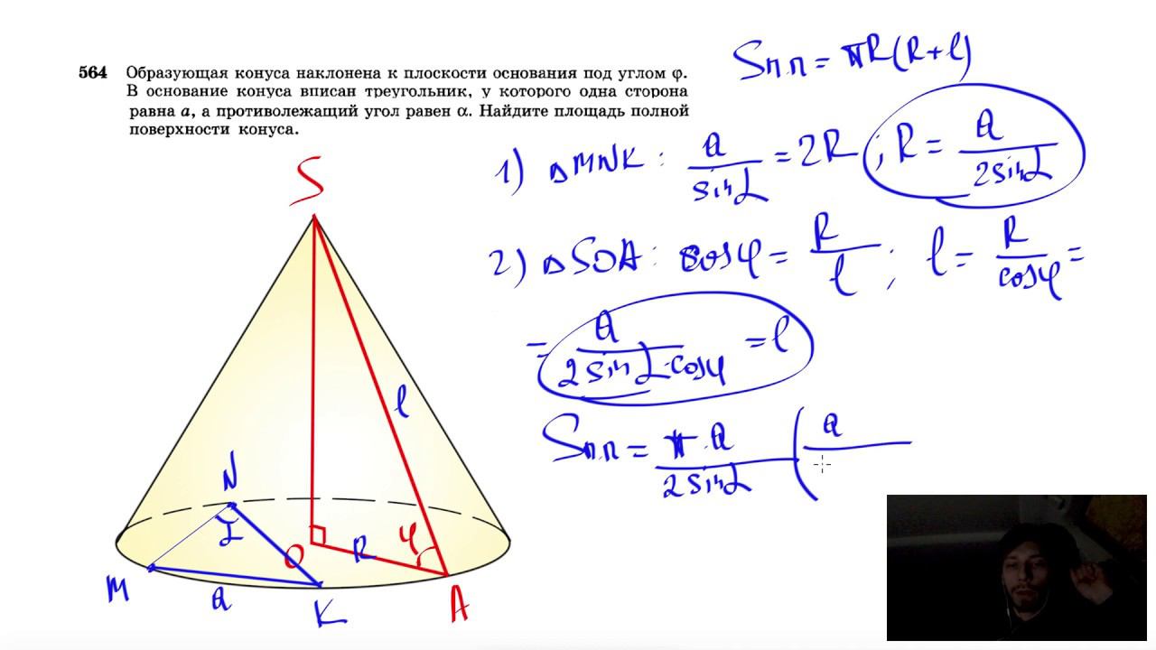 №564. Образующая конуса наклонена к плоскости основания под углом φ. В основание конуса вписан треугольник, у которого одна сторона равна a, а противолежащий угол равен α. Найдите площадь полной поверхности конуса. Поддержать канал рублём - 5469400944002125 (Сбербанк) Мой второй канал для подготовки к ЕГЭ и ОГЭ - https://www.youtube.com/ЕвгенийСумин Инстаграм - https://www.instagram.com/EGE_OGE.math Личный инстаграм - https://www.instagram.com/ee_sumin VK - https://vk.com/evgeniysumin FB - https://www.facebook.com/EvgeniySumin