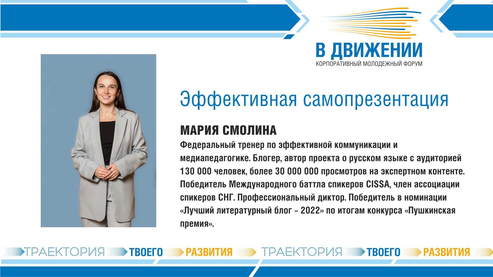 13 апреля 2023 года. Прямая трансляция выступления спикера корпоративного молодёжного форума «В движении» Марии Смолиной.