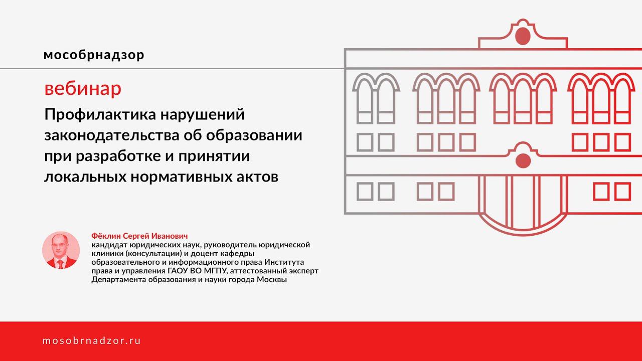 Вебинар «Профилактика нарушений законодательства об образовании при разработке и принятии локальных нормативных актов» был проведен в рамках проекта Мособрнадзор.РФ 28 декабря 2020 года. Ведущий вебинара - Фёклин С.И. Страница вебинара на сайте проекта - http://mosobrnadzor.ru/prevention/webinars/2020-12-28_17-00