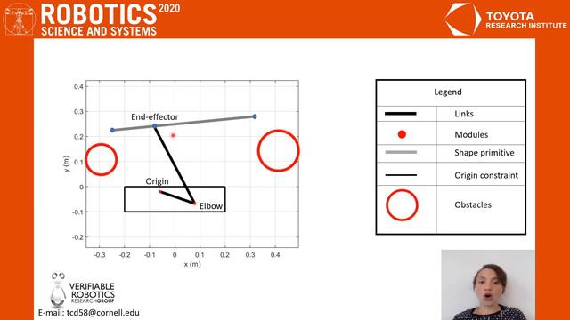 **Automated Synthesis of Modular Manipulators’ Structure and Control for Continuous Tasks around Obstacles** Thais Campos de Almeida (Cornell University)*; Samhita Marri (Cornell University); Hadas Kress-Gazit (Cornell) Publication: http://www.roboticsproceedings.org/rss16/p030.pdf supplementary video: https://youtu.be/9Uvyu2FJtVM software: https://github.coecis.cornell.edu/tcd58/Shape-Primitives **Abstract** In this work, we describe an end-to-end system for automatically synthesizing correct-by-construction structure and controls for modular manipulators from high-level task specifications. We define specifications that include both continuous trajectories the end-effector must follow and constraints on the physical space (obstacles and possible locations of the base of the manipulator). In our formulation, trajectories are composed of basic shape primitives (lines, arcs, and circles) and we avoid discretizing the desired trajectory, as other approaches in the literature do. We encode the task as a set of constraints on the manipulator’s kinematics and return the manipulator’s structure and associated control to the user, if a solution is found. By solving for the continuous trajectory, as opposed to a discretized one, we ensure that the original task is satisfied. We demonstrate our approach on three different specifications, and present the resulting physical robots tracing complex trajectories in the presence of obstacles.