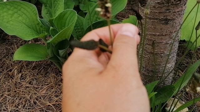 Подорожник Ланцетолистный (Plantágo lanceoláta) в теневой клумбе. 2024.