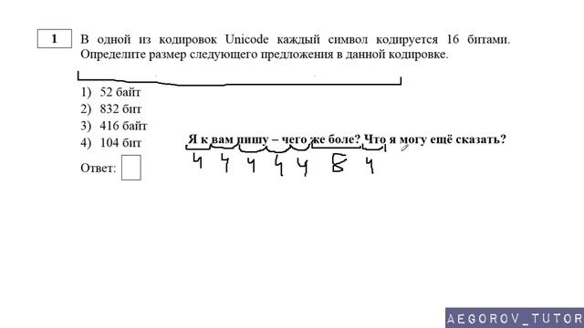 Разбор задания № 1 из ДЕМО варианта 2018 по ОГЭ информатике и ИКТ Тема задачи "Количество информации в тексте" Добавляйтесь в группу https://vk.com/aegorov_tutor Предложить задачу для разбора https://vk.com/topic-116207750_38371445 Задать вопрос по задаче из ОГЭ https://vk.com/topic-116207750_37403077