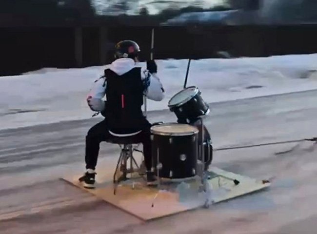 Жители Ленобласти стали свидетелями необычного перформанса. Лихой барабанщик устроил концерт "с ветерком" на региональной дороге. Платформу с музыкальным инструментом прикрепили к легковой машине. Видео с концертом на ходу разместил в сети сам барабанщик. На кадрах - музыкант, исполняющий соло, на скользящей по зимней дороге платформе. Стоит отметить, что барабанщик во время выступления был в шлеме, а на ночной дороге не было ни одной машины.