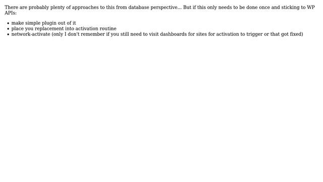 Wordpress: Help running a MySQL query to update all wp_#_options tables in a Multisite install Helpful? Please support me on Patreon: https://www.patreon.com/roelvandepaar With thanks & praise to God, and with thanks to the many people who have made this project possible! | Content (except music & images) licensed under CC BY-SA https://meta.stackexchange.com/help/licensing | Music: https://www.bensound.com/licensing | Images: https://stocksnap.io/license & others | With thanks to user Rarst (wordpress.stackexchange.com/users/847), user Mason James (wordpress.stackexchange.com/users/7374), and the Stack Exchange Network (wordpress.stackexchange.com/questions/24185). Trademarks are property of their respective owners. Disclaimer: All information is provided "AS IS" without warranty of any kind. You are responsible for your own actions. Please contact me if anything is amiss at Roel D.OT VandePaar A.T gmail.com
