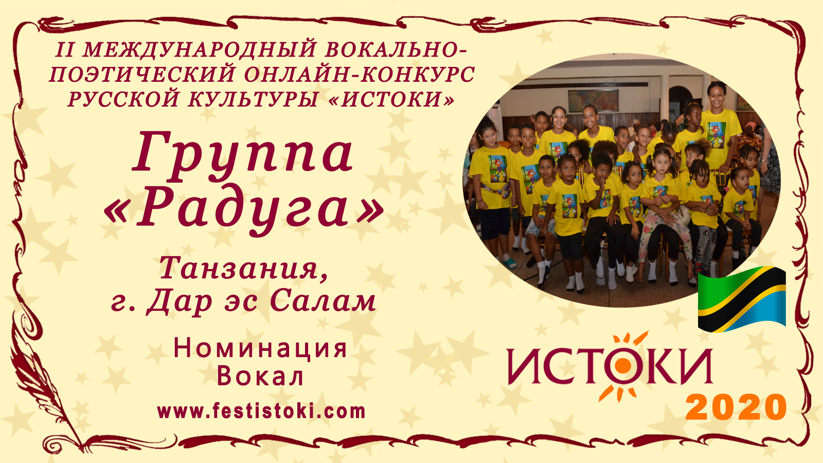 Дипломант II Международного вокально-поэтического онлайн-конкурса русской культуры «Истоки». Номинация - Вокал. Песня " Я весь день сижу на крутом бережку" Композитор Борис Савельев, автор текста Аркадий Хайт. Сайт: www.festistoki.ru / www.festistoki.com E-mail: festistoki@mail.ru