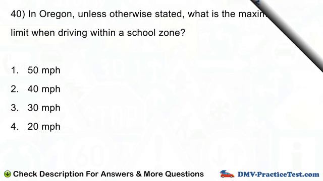 ---- https://dmv-practicetest.com/or-oregon-dmv-practice-test-1/ Visit For More Explanations Of The Answers, More Tests & More Questions. Answers: 1 - 1. Red 2 - 3. Slow down and watch for children 3 - 3. Get off at the next exit, then locate the freeway entrance going the opposite direction 4 - 1. You don’t have enough room on the other side to completely cross the railroad tracks 5 - 2. Before the crosswalk 6 - 4. All of the above 7 - 4. Pull to the curb and look around to see where the emergency vehicle is 8 - 2. Slow down, increase your following distance, and pass the construction zone carefully 9 - 2. The driver going straight 10 - 4. No, you can block traffic by doing so 11 - 1. Police officer 12 - 1. Give aid to the injured driver, but do not move him/her 13 - 2. The lane closest to the left curb 14 - 4. The driver to stop the truck safely 15 - 3. Green background, white letters 16 - 1. At least 100 feet before the turn 17 - 2. Wait in the Center of the intersection before proceeding with the turn 18 - 3. 0.08 19 - 3. Vehicles already in a traffic circle 20 - 3. May have to make a wide swing to complete the turn 21 - 4. All of the above 22 - 4. All of the above 23 - 4. The first rain after a period of dryness 24 - 3. Stop, and proceed when it is safe to do so 25 - 3. You can make the other drivers angry and frustrated 26 - 3. Depressant 27 - 1. Use low beam headlights 28 - 4. Yellow background, black text or symbols 29 - 4. Your action increases the chances of an accident 30 - 2. Turn on your headlights on 31 - 2. Stay farther behind the truck than you normally would 32 - 1. Stop and proceed when the traffic clears at the intersection 33 - 1. Drive carefully, and avoid making fast turns and sudden stops 34 - 3. In front of a private driveway 35 - 2. 1 hour 36 - 2. Drive within the range of your headlights 37 - 2. Under no circumstance 38 - 3. 1 and 2 39 - 2. When the vehicle is equipped with seat belts 40 - 4. 20 mph 41 - 4. 2 and 3 42 - 1. 15 mph 43 - 4. All of the above 44 - 4. White cane 45 - 4. Stop for rest periodically 46 - 1. The “no zone” 47 - 4. 1 and 3 48 - 2. 3 hours 49 - 1. You must enter the bicycle lane only after ensuring there is no bicycle traffic, and then make the turn. 50 - 4. 2 and 3 51 - 1. The lane is a HOV lane 52 - 3. You may stop temporarily to pickup or discharge passengers only 53 - 4. Insure the bicycle 54 - 3. Accelerate quickly to freeway speed and merge with the traffic 55 - 3. Look to the right side of the road 56 - 4. 1 and 2 57 - 1. 30 58 - 2. The vehicle on the right 59 - 1. No effect 60 - 3. Never 61 - 2. Be ready to stop 62 - 2. 300 63 - 2. Move as far as possible to the left side of your lane 64 - 1. Think before you take actions 65 - 3. 20 mph 66 - 1. Drivers to reach the proper speed before merging with the expressway traffic 67 - 2. Motorcycles are smaller 68 - 1. When the red lights are flashing 69 - 3. Left arm bent upwards 90 degrees 70 - 3. Use hands-free devices and keep both hands on the steering wheel 71 - 1. Only when traffic on the street moves to the left 72 - 3. Take a cab 73 - 3. When you have a broken line on your side of the road 74 - 2. To keep traffic flowing smoothly 75 - 3. When the railroad signal warns of the approach of a train 76 - 1. Slow down and prepared to stop if needed 77 - 4. An orange triangle sign 78 - 3. Take your foot off the gas pedal slowly and slow the car down 79 - 3. Right Turn 80 - 2. Slow down and be prepared to stop before the intersection if it is safe to do so ---- oregon dmv written test practice, dmv permit practice test oregon, free dmv practice test oregon, oregon dmv drivers license practice test, oregon dmv online practice test, dmv practice permit test oregon, dmv test practice oregon, practice dmv test oregon, free oregon dmv permit practice test, practice oregon dmv test, oregon dmv driving test practice, oregon dmv hazmat practice test, dmv oregon permit practice test, dmv medford oregon practice test, oregon dmv permit practice test in spanish, dmv motorcycle practice test oregon, albany oregon dmv practice test, dmv salem oregon practice test, dmv practice test oregon drivers license, free oregon dmv knowledge test practice, oregon dmv learners permit practice test, oregon dmv practice test 500, oregon dmv permit practice test quizlet, oregon dmv practice license test, oregon dmv free practice test, oregon dmv knowledge practice test, oregon dmv practice written driving test, oregon dmv written practice test, oregon dmv knowledge test practice, dmv oregon permit test practice, oregon dmv safety test practice, oregon dmv motorcycle endorsement practice test, oregon dmv motorcycle permit practice test, dmv oregon practice knowledge test, dmv knowledge test practice oregon, medford oregon dmv practice test, dmv driving practice test oregon, dmv practice license test oregon, dmv oregon practice test permit, medford oregon dmv permit practice test, dmv practice test for oregon