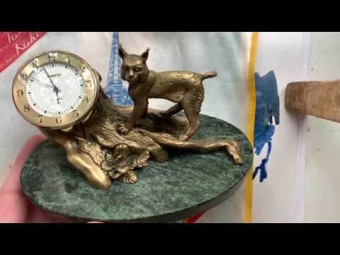 Видеообзор на настольные кварцевые часы «Ракета» Петродворцового Часового Завода второй половины 1980-х годов. Циферблат белого цвета. Фигуры рыси и пня выполнены из бронзы. Подставка каменная, изготовлена из змеевика. Размеры 15x8,5x9 см. Присутствуют в каталоге Ракета 1989 г. Механизм-2356.
