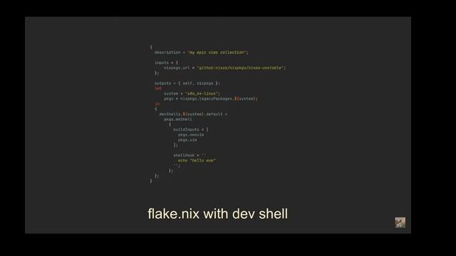 Видео с канала https://www.youtube.com/@vimjoyer/videos Discord server: https://discord.gg/AqHbaeK43b Donations: https://ko-fi.com/vimjoyer Enabling flakes: https://nixos.wiki/wiki/Flakes - commands are here Creating a flake: $ nix flake init Updating a flake: $ nix flake update Flake: ``` { description = "my epic vims collection"; inputs = { nixpkgs.url = "github:nixos/nixpkgs/nixos-unstable"; }; outputs = { self, nixpkgs }: let system = "x86_64-linux"; pkgs = nixpkgs.legacyPackages.${system}; in { bob = pkgs.mkShell { buildInputs = [ pkgs.neovim pkgs.vim ]; shellHook = '' echo "hello mom" ''; }; }; } ``` (yes, I know I could push it to github, but I'm extra lazy today)