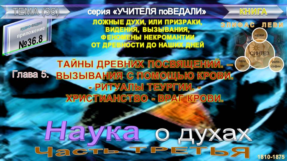 ФЕНОМЕНЫ НЕКРОМАНТИИ ОТ ДРЕВНОСТИ ДО НАШИХ ДНЕЙ (3 ч)- глава 5, ТАЙНЫ ДРЕВНИХ ПОСВЯЩЕНИЙ,-ВЫЗЫВАНИЯ С ПОМОЩЬЮ КРОВИ, РИТУАЛЫ ТЕУРГИИ-ХРИСТИАНСТВО - ВРАГ КРОВИ- Элифас Леви (1810-1875). Представляем вашему вниманию последнюю из работ, издававшихся Элифасом Леви прижизненно - «Наука о духах». Это впервые переведенный на русский язык труд, который поможет проникнуть в историю изучения духов. «Науку о духах» Элифас разделил на три части. В первой речь идет о «духах» евангельских легенд. Вторая часть посвящена духам как существам, т.е. демонам, душам усопшим и прочим. В третьей части Элифас переходит к рассмотрению спиритических феноменов, некромантии, начиная со случаев, описанных в Библии, и заканчивая современным спиритизмом. Книга будет полезна всем, интересующимся классическим оккультизмом, в особенности, сторонникам французской оккультной Школы.