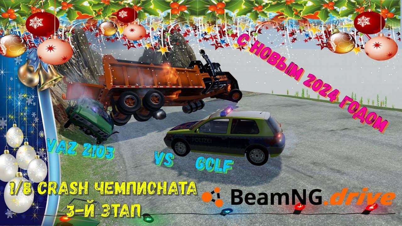 #beamngdrive Надеюсь все живы после прошедшей ночки кто-то продолжает праздновать кто-то и не заканчивал но всех Вас с наступившим 24-м годом Пусть принесет ВАм удачу, успех, Здоровье и Все блага!!! Стартует 2-й краш Чемпионат бимки правила прежние 16 рандомных машин соревнуется за выход в финал. Соревнование состоит из 3-х этапов, этап состоит из трех испытаний за которые начисляются баллы кто больше наберет тот и проходит дальше. Финалисты первого чемпионата участвовать не могут. И так первые участники Ваз 2103 против Фольксваген гольф полиции Германии. Пожелаем удачи нашим участникам. 3-й Этап
