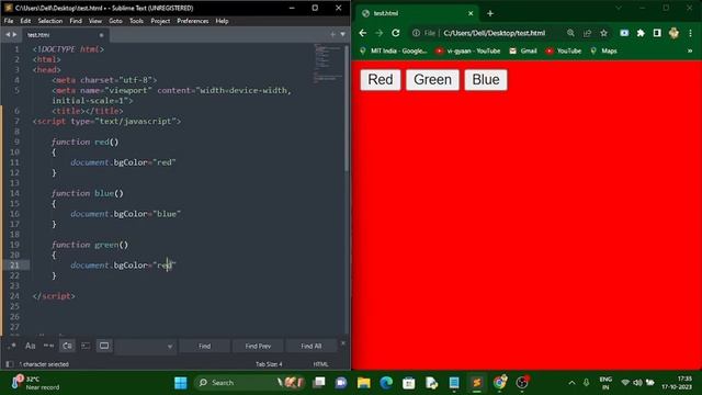 In this example, we create 3 buttons and call JavaScript functions to apply background and foreground colour to the window and text respectively. @mitindia81 JavaScript functions are blocks of reusable code that perform a specific task or set of tasks. They are a fundamental part of JavaScript and are essential for building dynamic and interactive web applications.