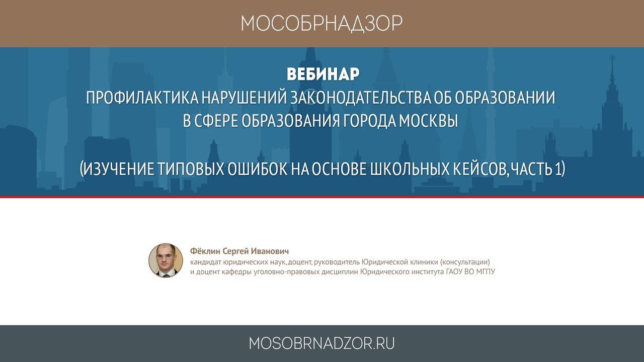 Вебинар «Профилактика нарушений законодательства об образовании в сфере образования города Москвы (изучение типовых ошибок на основе школьных кейсов, часть 1)» был проведен в рамках проекта Мособрнадзор.РФ 22 декабря 2017 года. Ведущий вебинара - Феклин С.И. Страница вебинара на сайте проекта - http://mosobrnadzor.ru/supervision/webinars/2017-12-22_10-00