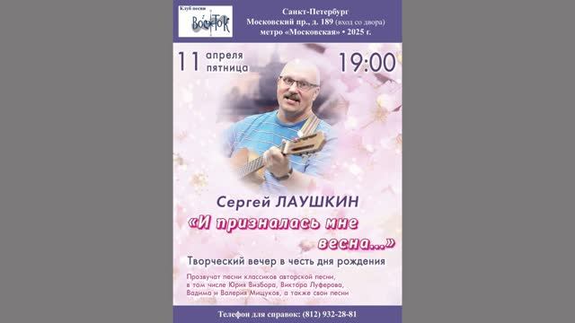 Сергей Лаушкин. «И призналась мне весна...» Творческий вечер в честь дня рождения. Клуб песни «Восток». 11 апреля 2025 г. Видеозапись - Алла Левитан. Запись звука - Герман Колосов. Афиша - Елена Адрианова. Санкт-Петербург, Московский пр., д. 189.