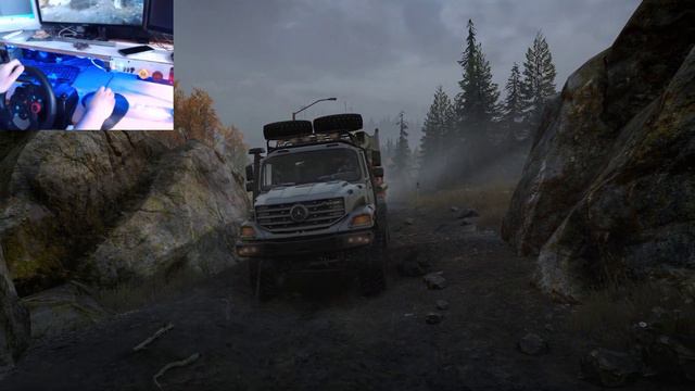 Transporting big generqator-trailer using the Mercedes in SnowRunner, played with the Logitech G29 & shifter.