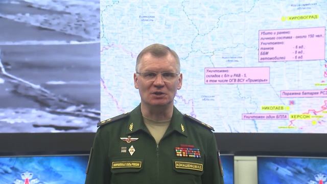 ? Сегодня Вооруженными Силами Российской Федерации продолжено нанесение массированного удара высокоточным оружием большой дальности воздушного и морского базирования по объектам военного управления и системы энергетики Украины. Цель удара достигнута. Все назначенные объекты поражены. ? На Купянском направлении противник силами двух рот предпринял безуспешную попытку атаковать позиции российских войск в направлениях населенных пунктов Крахмальное Харьковской области и Стельмаховка Луганской Народной Республики. В результате активных действий наших войск противник отброшен на исходные позиции. Уничтожено до 40 украинских военнослужащих и четыре боевые бронированные машины. ? На Краснолиманском направлении ВСУ силами до двух ротных тактических групп попытались в очередной раз форсировать реку Жеребец в направлениях населенных пунктов Райгородки и Нововодяное Луганской Народной Республики. Упреждающим огневым поражением две наводимые переправы разрушены. Уничтожено до 20 украинских военнослужащих и четыре пикапа. Выдвинувшаяся к ним на помощь рота 66-й механизированной бригады ВСУ попала на минное поле, где часть военной техники подорвалась. Личный состав был поражен огнем российской артиллерии. Уничтожено более 80 украинских военнослужащих, восемь боевых бронированных машин и четыре пикапа. ? На Запорожском направлении противник проводил контратаки силами трех ротных тактических групп в районах населенных пунктов Никольское, Новомайорское и Степное Донецкой Народной Республики. Все атаки отражены. Уничтожено более 30 украинских военнослужащих, один танк и три боевые бронированные машины. ? На Николаево-Криворожском направлении вооруженные силы Украины в течение дня пытались вести наступательные действия силами до двух батальонных тактических групп в направлении населенных пунктов Борозенское, Пятихатки, Брускинское, Ищенка Херсонской области, а также Петровское Николаевской области. Активными действиями российских войск при поддержке артиллерии противник был рассеян и отброшен к исходным позициям. Уничтожено около 150 украинских военнослужащих, шесть танков, восемь боевых бронированных машин и шесть автомобилей. ? Ударами оперативно-тактической и армейской авиации, ракетных войск и артиллерии поражен пункт управления 66-й механизированной бригады ВСУ в районе населенного пункта Новое Донецкой Народной Республики, а также 46 артиллерийских подразделений на огневых позициях, живая сила и военная техника в 156-ти районах. ◽ Уничтожены две базы хранения топлива для украинской военной техники в районах городов Днепропетровск и Павлоград Днепропетровской области, пять складов боеприпасов и ракетно-артиллерийского вооружения, в том числе объединенной группировки войск ВСУ «Приморье» в районе города Николаев. В районе населенного пункта Предтечино Донецкой Народной Республики уничтожен склад боеприпасов с реактивными снарядами к американским системам залпового огня «HIMARS». В районе населенного пункта Марьянское Днепропетровской области ВКС России сбит вертолет Ми-24 воздушных сил Украины. ? Средствами противовоздушной обороны в воздухе за сутки уничтожены семь беспилотных летательных аппаратов, в том числе один ударный аппарат «Свитчблэйд-600», в районах населенных пунктов Благодатное, Кропивн